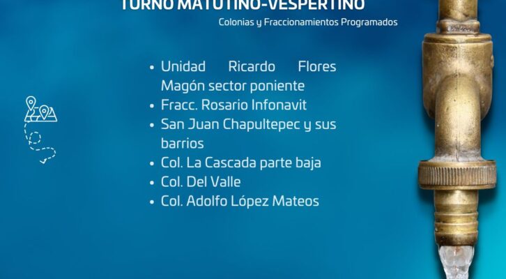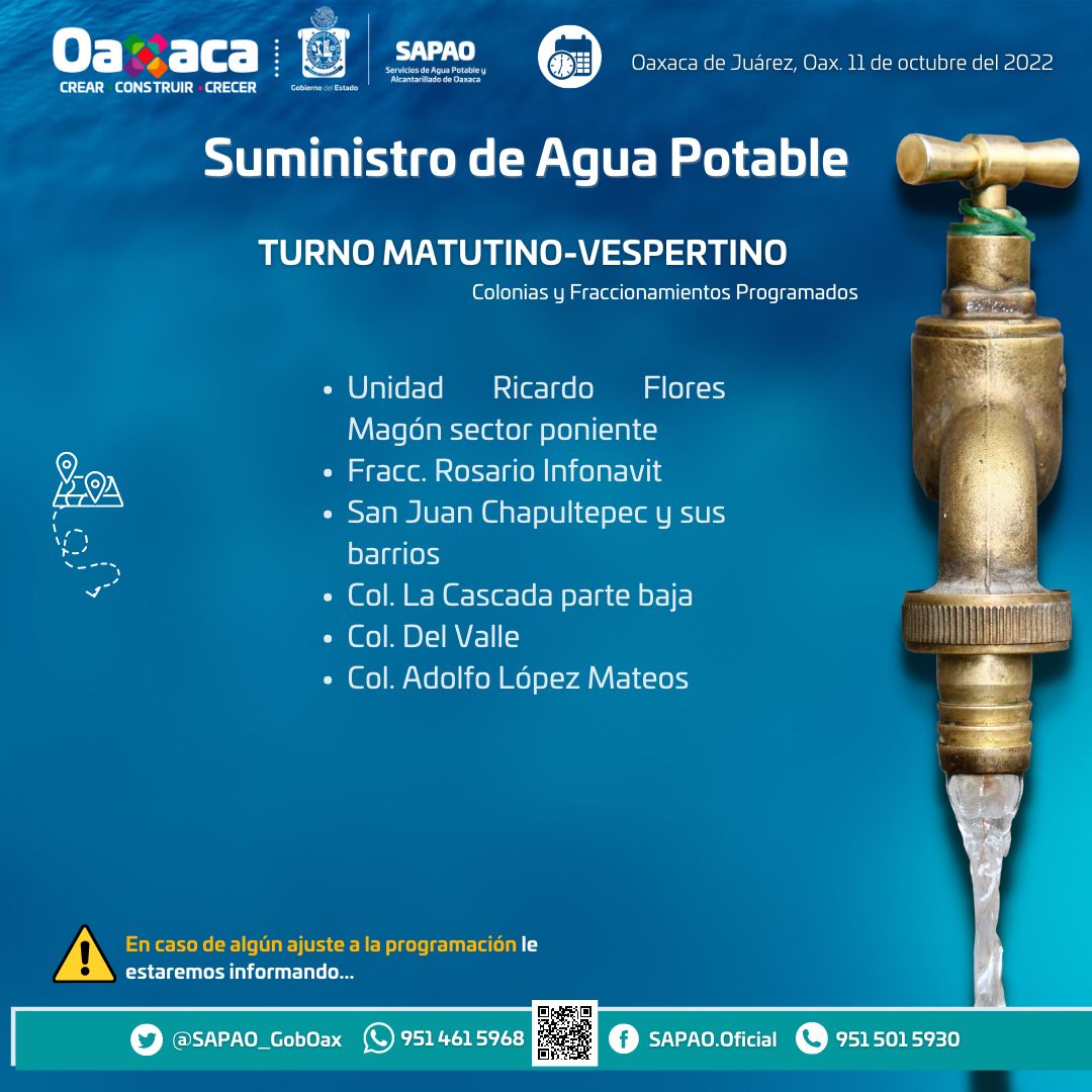 Oaxaca de Juárez, 11 de octubre. Conoce el suministro de agua potable del martes 11 de octubre de 2022 en el turno matutino-vespertino.