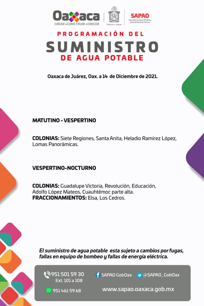 Oaxaca de Juárez, 14 de diciembre. Te invitamos a consultar el suministro de agua potable para este martes 14 de diciembre.