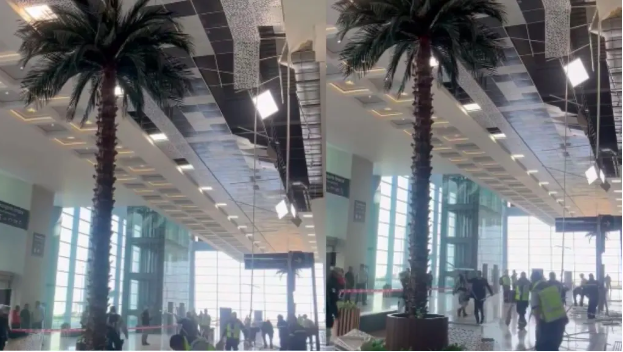 Oaxaca de Juárez, 24 de febrero. Un video en redes sociales registró el momento en que parte del techo del Aeropuerto Internacional Felipe Ángeles (AIFA) cae en el área de llegadas.