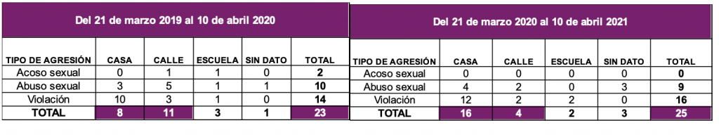 La responsable del programa de jóvenes de Consorcio Oaxaca, Elizabeth Mosqueda Rivera, destacó que, del 21 de marzo de 2021 al 10 de abril de 2021, el número de agresiones sexuales contra niñas y adolescentes en el estado se incrementó 50% al interior de los hogares (16 casos), en comparación con 8 casos registrados en el año anterior, del 21 de marzo de 2019 al 10 de abril de 2020. La joven feminista apuntó que, “si bien disminuyeron las agresiones sexuales tanto en la calle como en la escuela durante el confinamiento, es muy preocupante que niñas y adolescentes sigan siendo víctimas de violencia sexual en cualquier espacio, ya sea público o privado, aun en pandemia”.