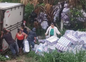 Minutos después del incidente, decenas de personas arribaron al lugar y comenzaron a llevarse los productos, sin que hubiera esfuerzos visibles por impedir el saqueo.