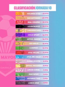 La cuarta posición es para Licántropos con 18 puntos, seguidos de Transformación Universitaria con 17, enseguida se ubican Ciclo Sport y Deportivo Ramos con 16 unidades, con 15 aparece LED UABJO, después se ubican Cachorros Ramos con 13, con 11 el Atlético Rojas, mismas unidades para el Atlético del Valle, en el fondo de la tabla aparecen Pumas, Progreso, Linces, Huayapam, Asturias y Lobos URSE.