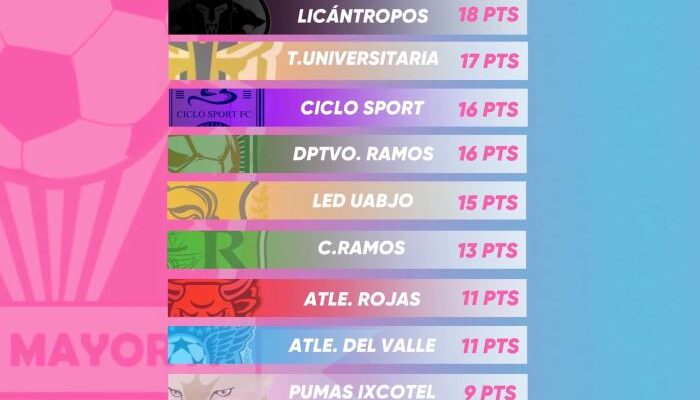 La cuarta posición es para Licántropos con 18 puntos, seguidos de Transformación Universitaria con 17, enseguida se ubican Ciclo Sport y Deportivo Ramos con 16 unidades, con 15 aparece LED UABJO, después se ubican Cachorros Ramos con 13, con 11 el Atlético Rojas, mismas unidades para el Atlético del Valle, en el fondo de la tabla aparecen Pumas, Progreso, Linces, Huayapam, Asturias y Lobos URSE.